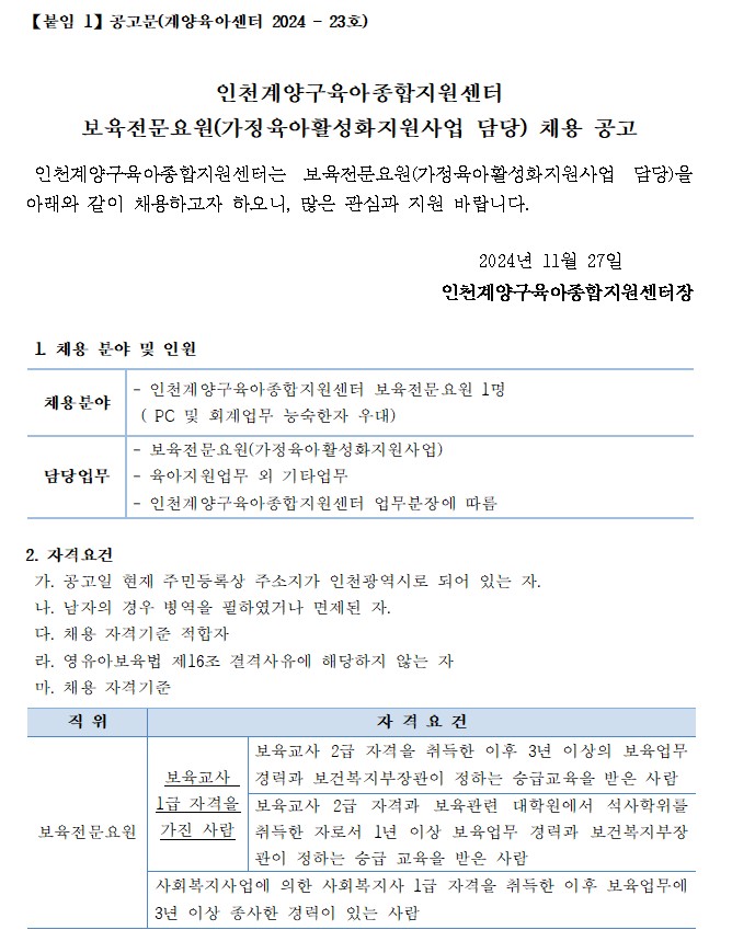 【붙임 1】공고문_가정육아활성화지원사업 담당자 채용 공고.hwp