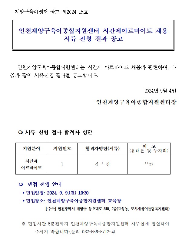 (본센터)시간제 아르바이트 채용 서류전형 합격자 공고