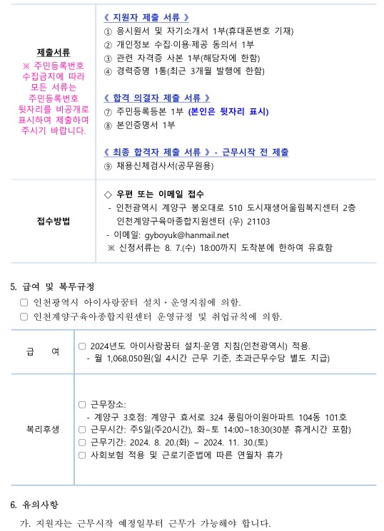 아이사랑꿈터 계양구 3호점 지원인력(운영요원) 채용 공고