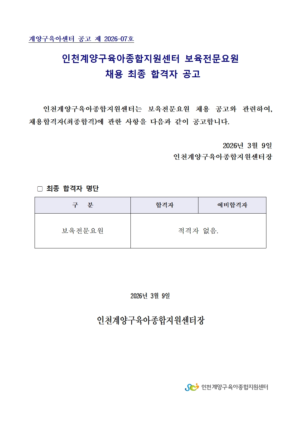 계양구육아종합지원센터 보육전문요원 채용 최종 합격자 공지