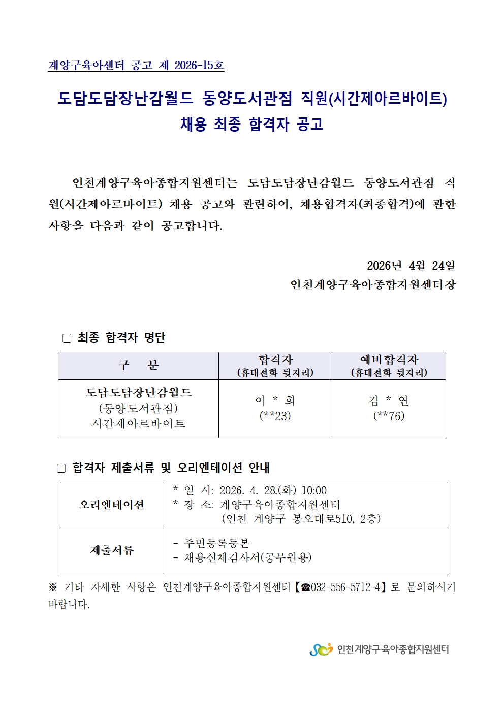 도담도담장난감월드 동양도서관점 직원(시간제 아르바이트) 최종합격자 공고