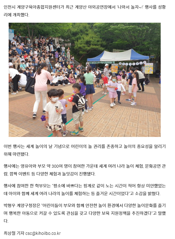 [기호일보]인천시 계양구육아종합지원센터, ‘나와서 놀자~!’ 행사 성료