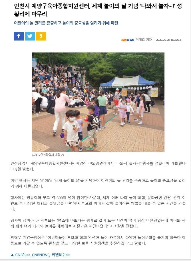 [cbn뉴스] 인천시 계양구육아종합지원센터, 세계 놀이의 날 기념 ‘나와서 놀자~!’ 성황리에 마무리
