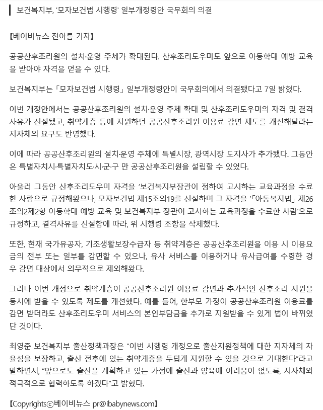 [베이비뉴스]산후조리도우미, 앞으로 아동학대 예방 교육 받아야 한다