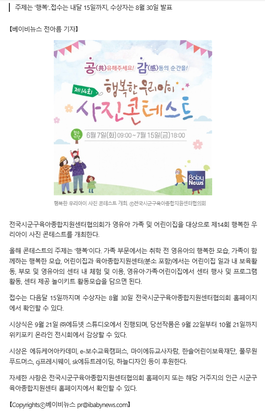[베이비뉴스]전국시군구육아종합지원센터협의회, 제14회 행복한 우리 아이 사진 콘테스트 진행