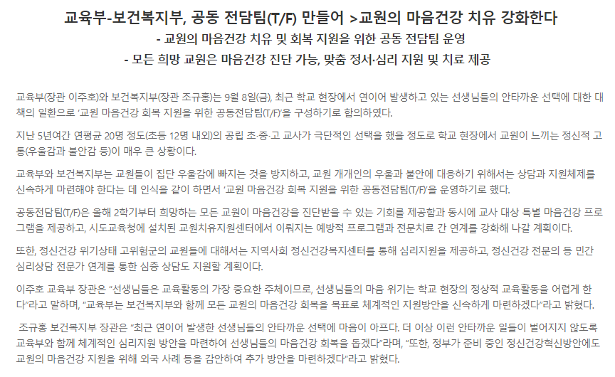 [보건복지부] 교육부-보건복지부, 공동 전담팀(T/F) 만들어 교원의 마음건강 치유 강화한다