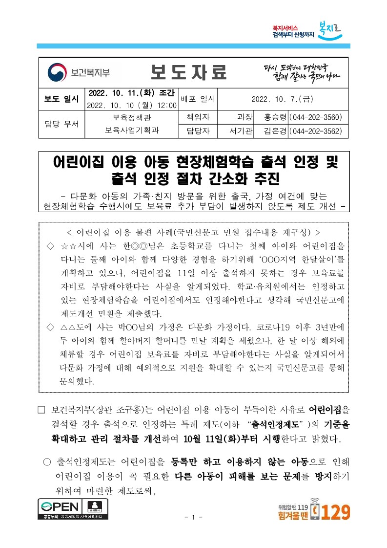 [보건복지부]어린이집 이용 아동 현장체험학습 출석 인정 및 출석 인정 절차 간소화 추진