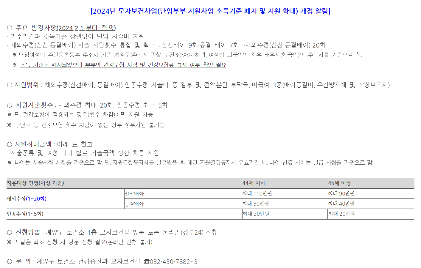 2024년 모자보건사업(난임부부 지원사업 소득기준 폐지 및 지원 확대) 개정 알림