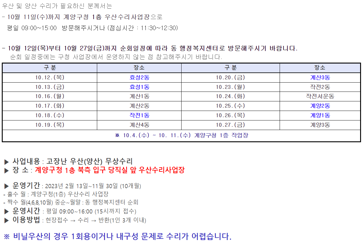 계양구 '우산수리 사업' 10월 동 순회일정 등 안내