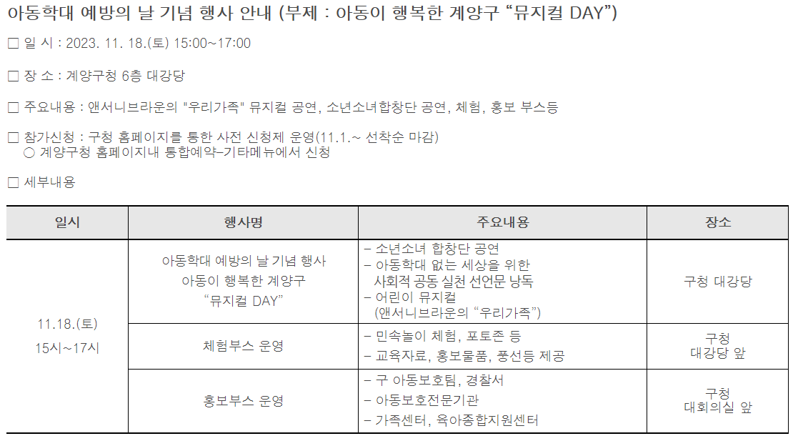 2023 아동학대 예방의 날 기념 행사 안내 (아동이 행복한 계양구 “뮤지컬 DAY”)