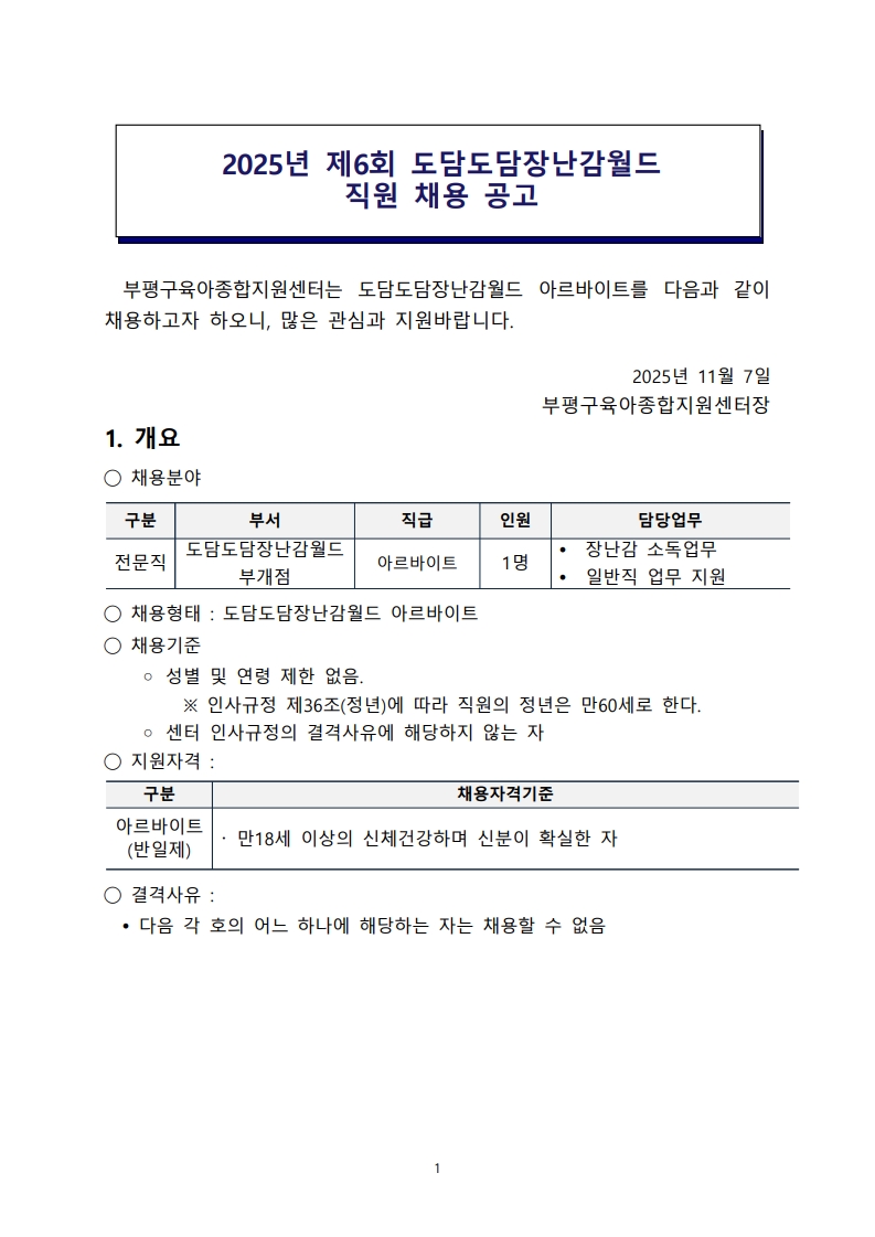 [부평구육아종합지원센터] 2025년 제6회 직원 채용 공고