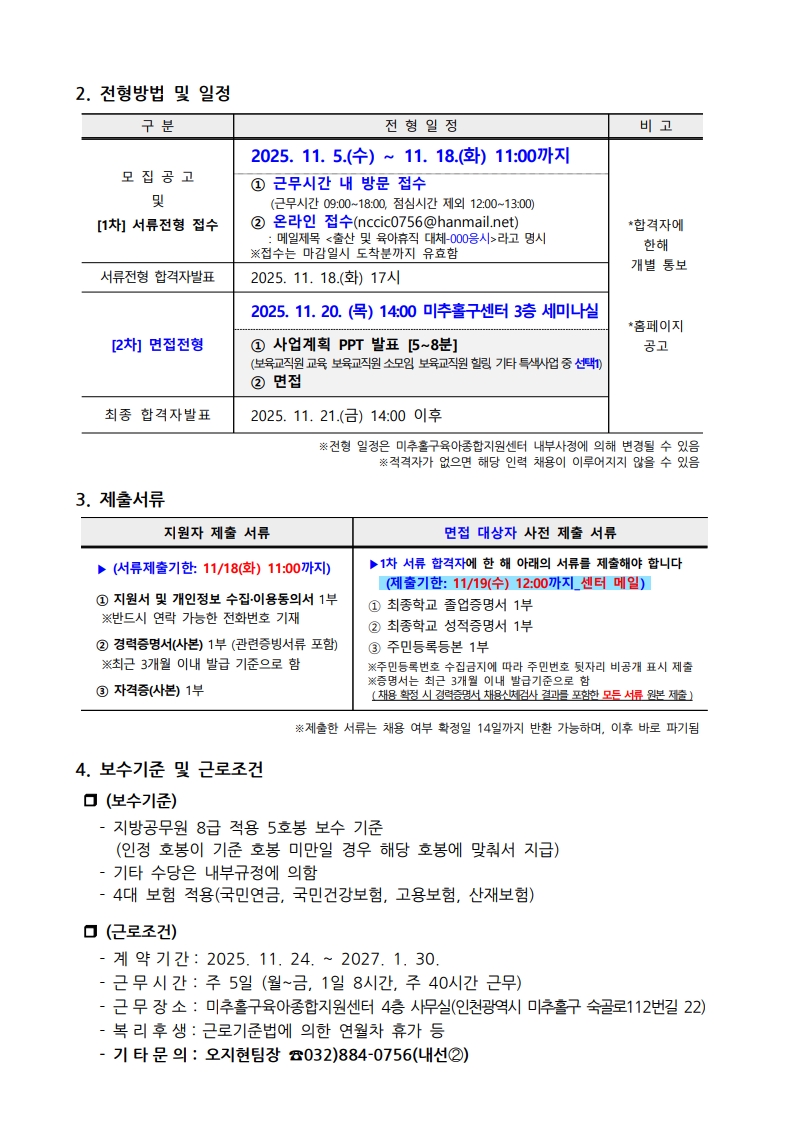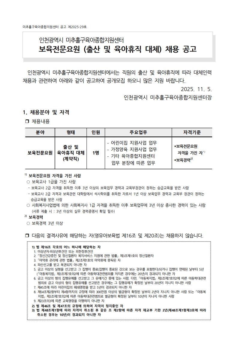 [인천 미추홀구육아종합지원센터] 보육전문요원(출산 및 육아휴직 대체) 채용 공고