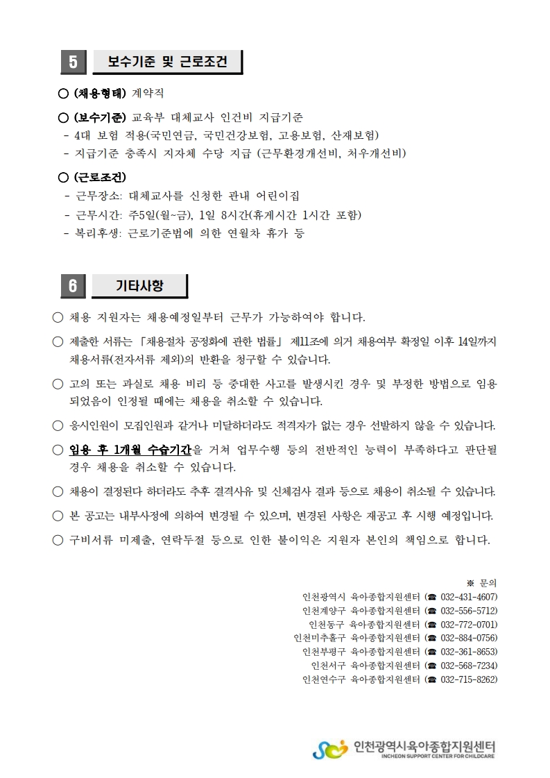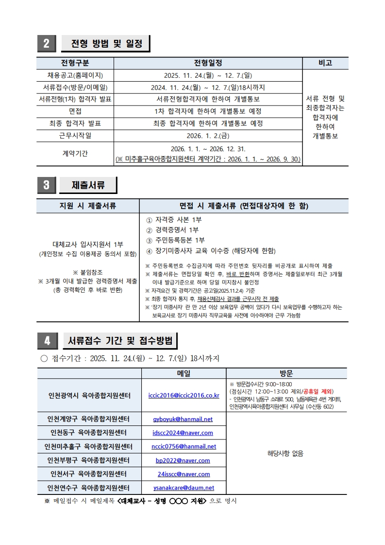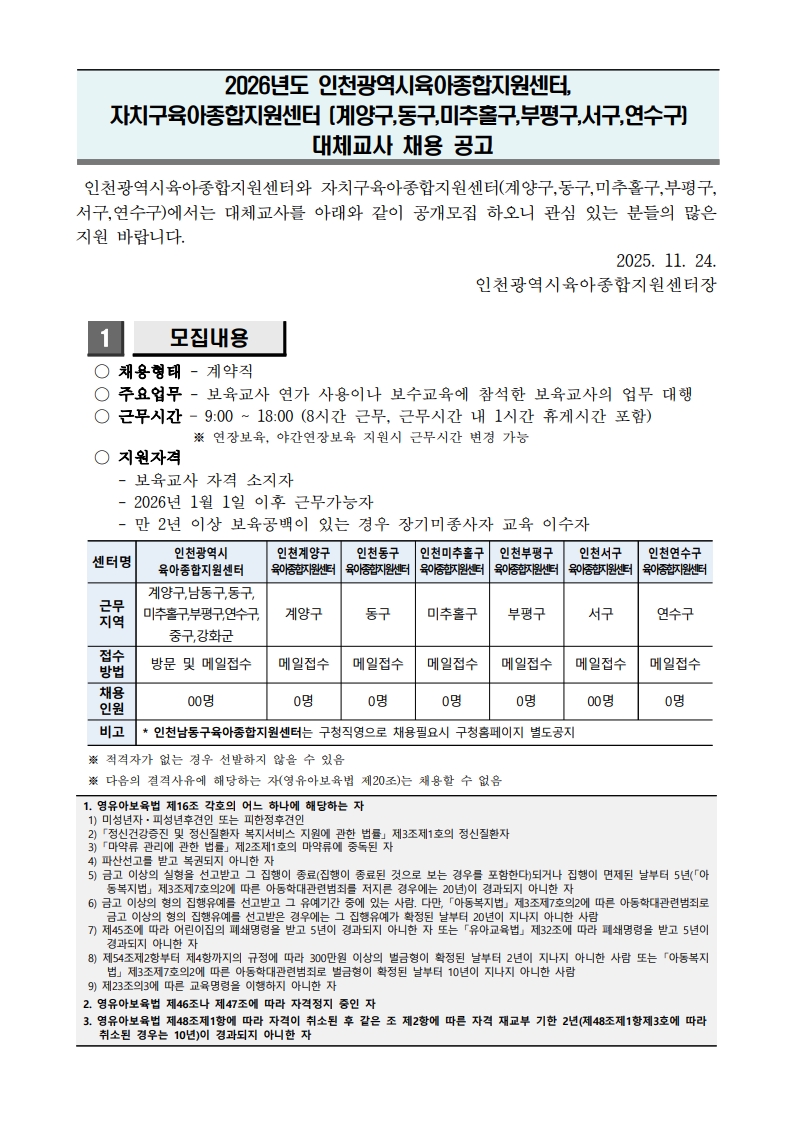 [인천광역시육아종합지원센터] 「2026년도 대체교사지원사업」 대체교사 인력채용 게시