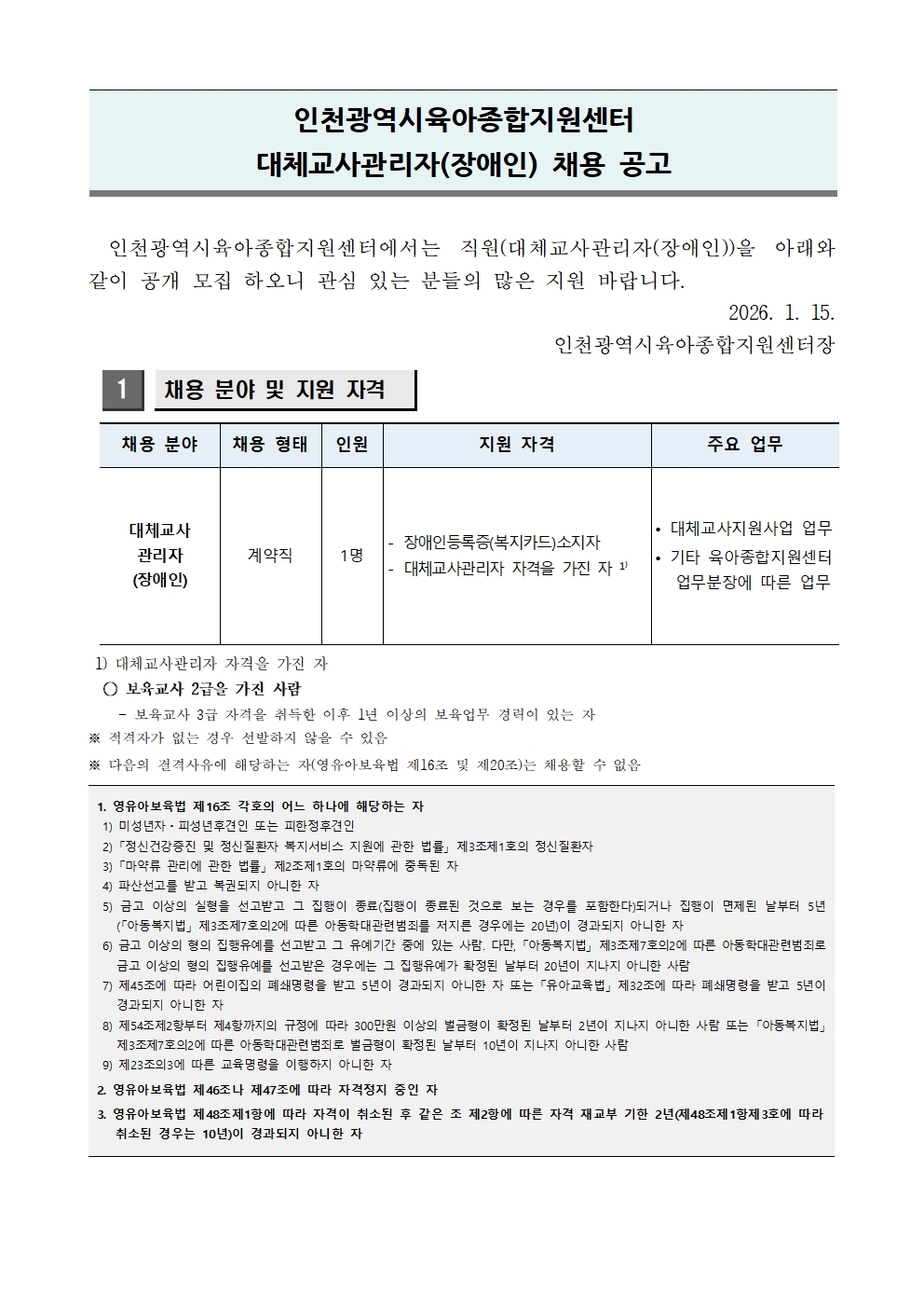 [인천광역시육아종합지원센터] 인천광역시육아종합지원센터 대체교사관리자(장애인) 채용