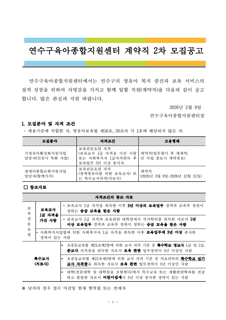 [연수구육아종합지원센터] 2026년 직원(계약직) 채용 공고