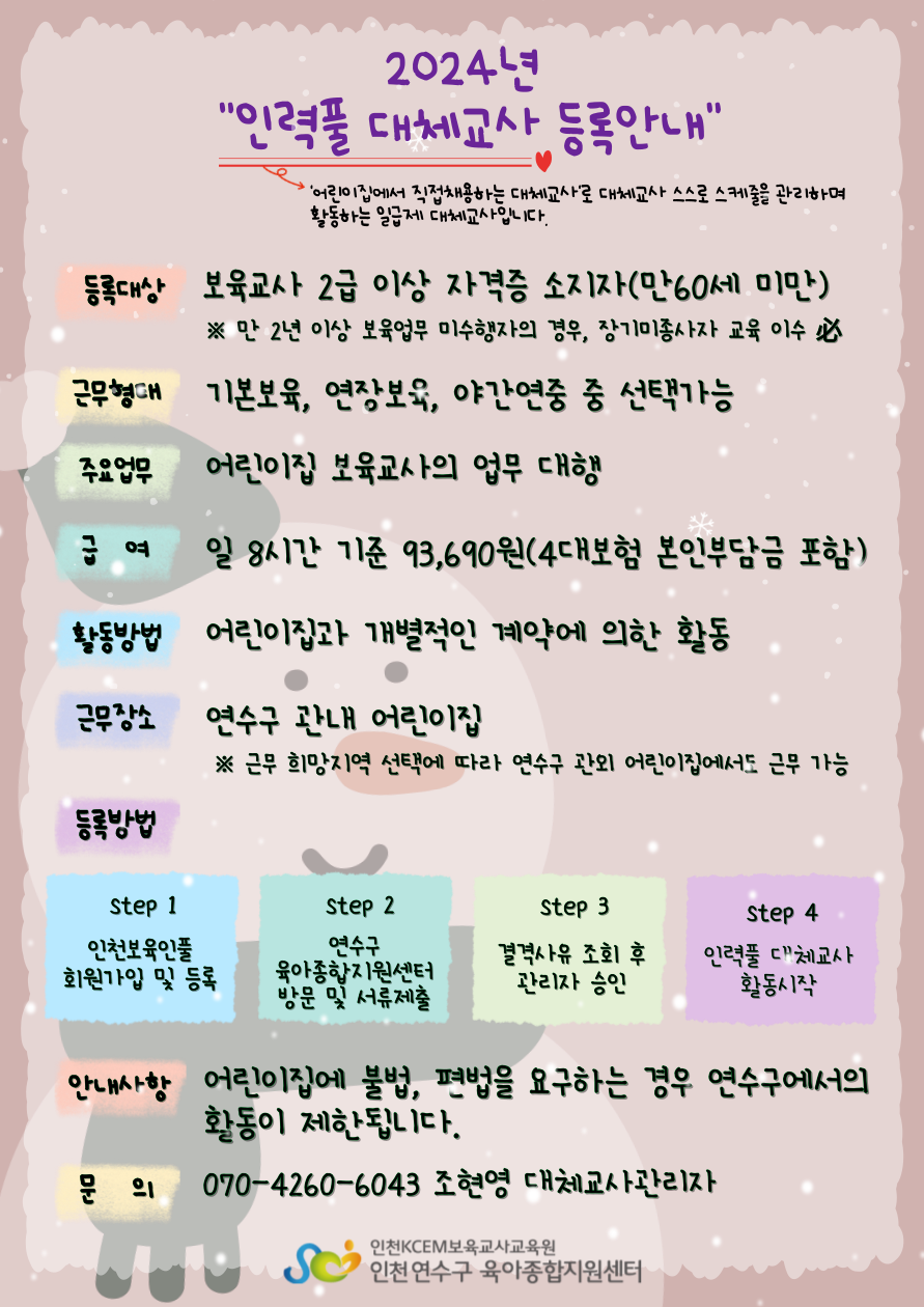 [연수구육아종합지원센터] 2024년 인력풀 대체교사 등록안내