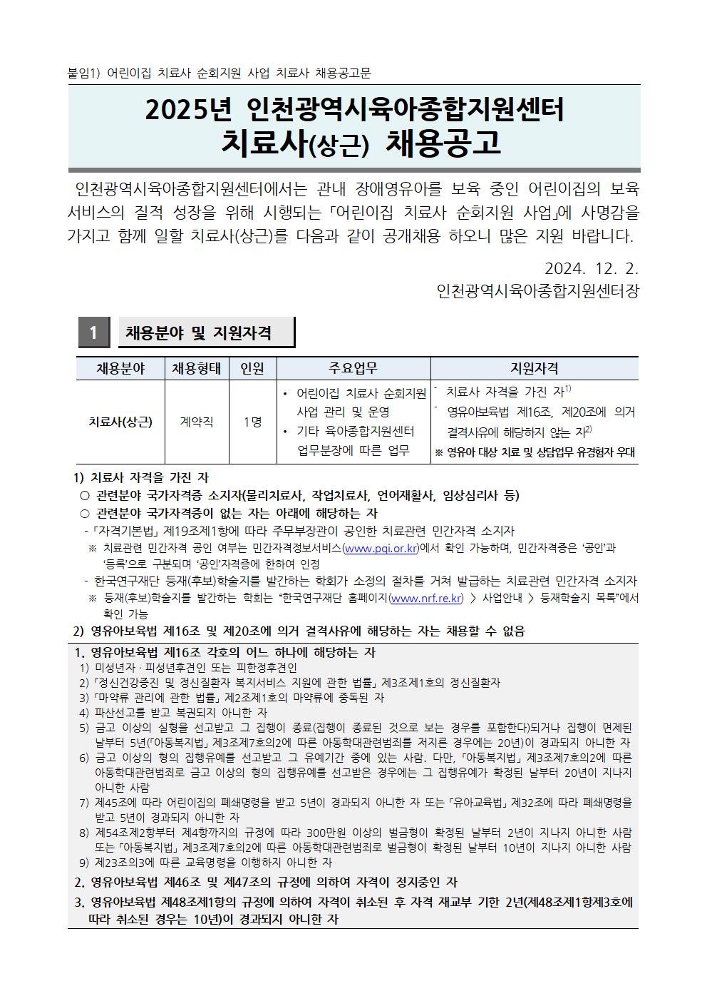 붙임1) 2025년 인천광역시육아종합지원센터 상근치료사 채용공고.hwp