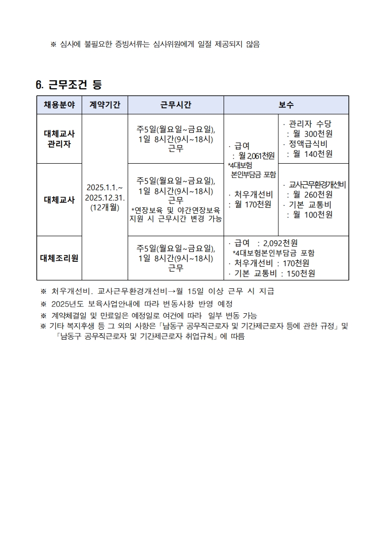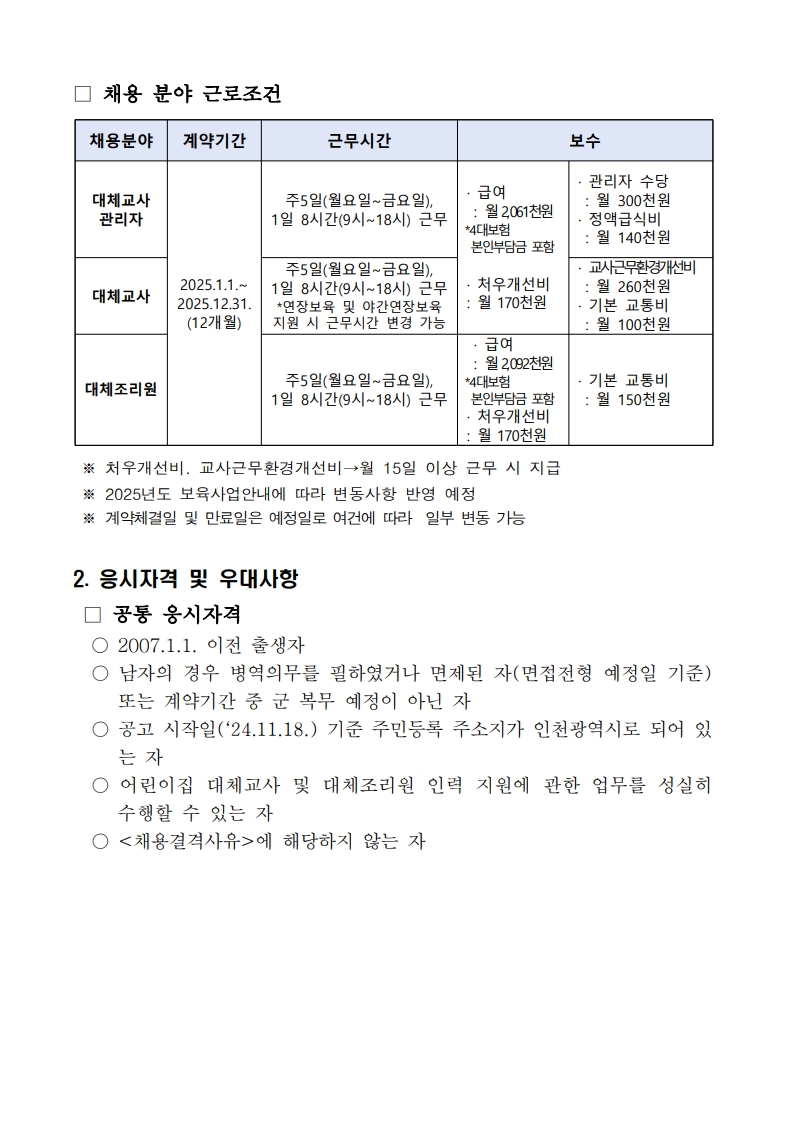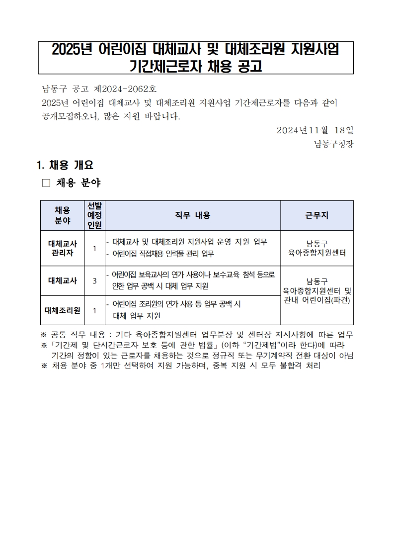 [남동구육아종합지원센터]2025년 어린이집 대체교사 및 대체조리원 기간제근로자 채용 공고