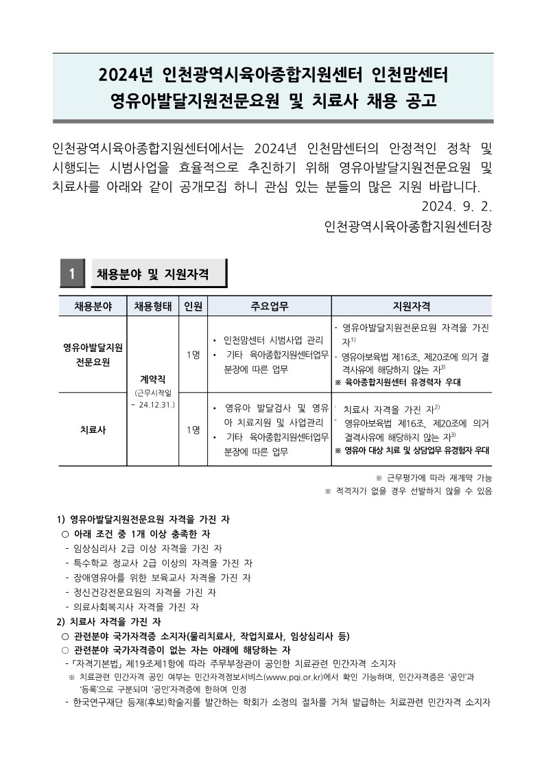 [인천시센터] 인천맘센터 영유아발달지원전문요원 및 치료사 채용 공고