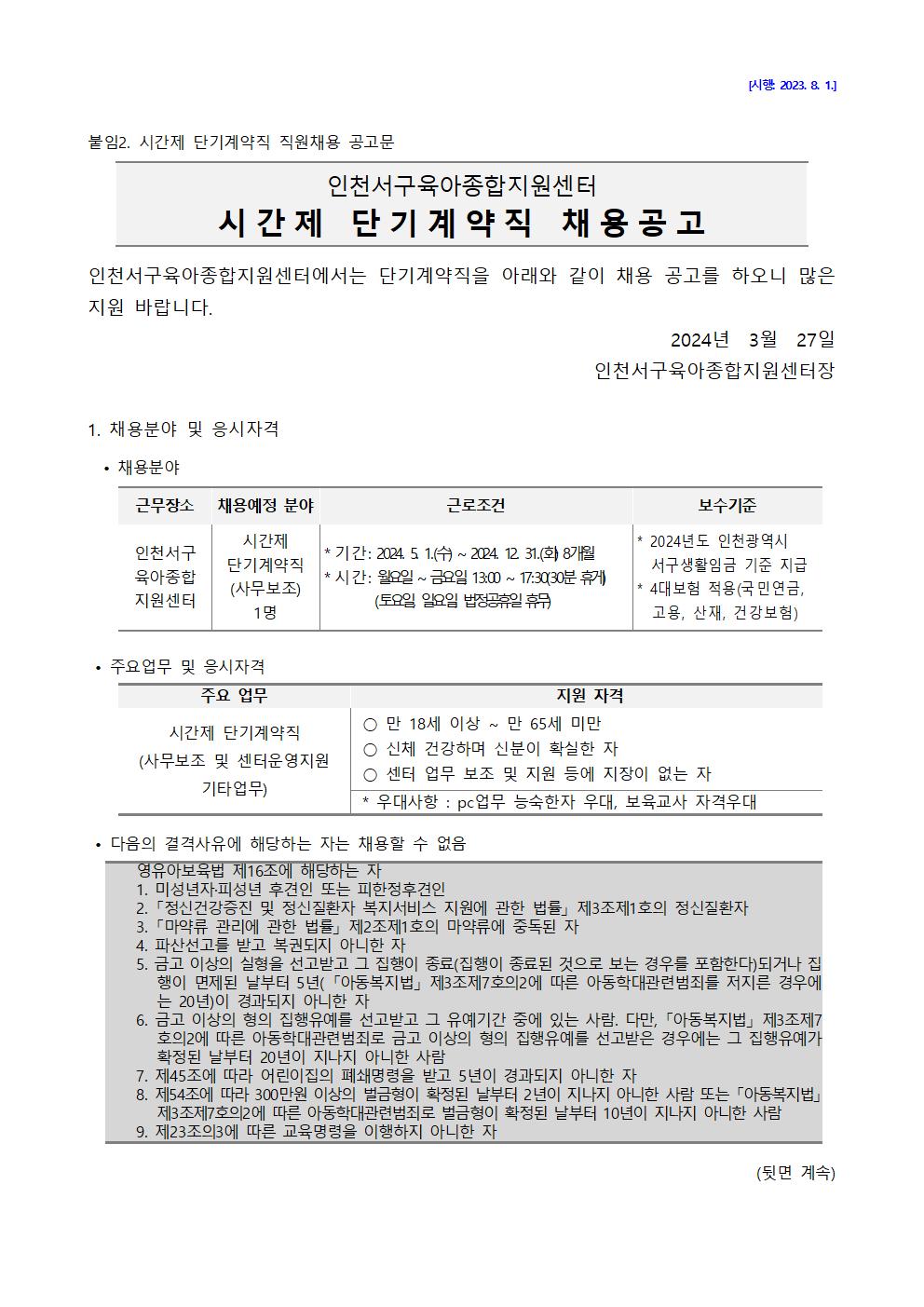 [서구센터] 2024년 단기계약직(사무보조) 직원 채용 공고
