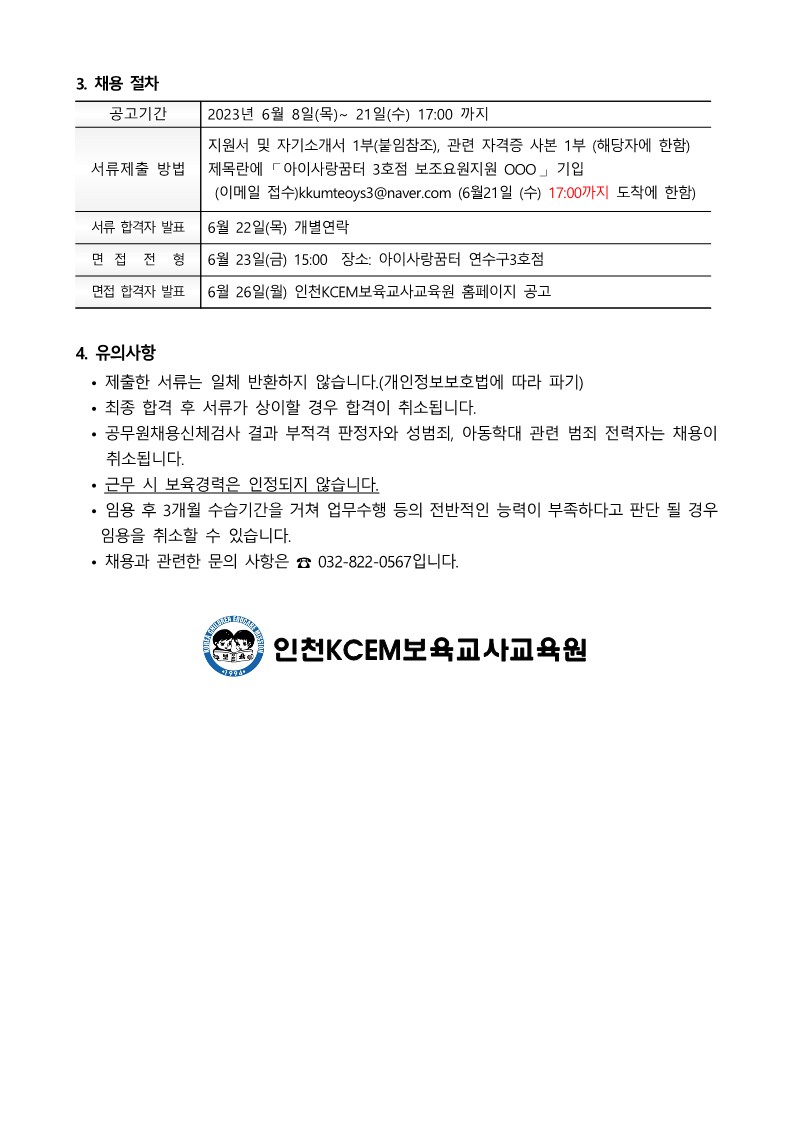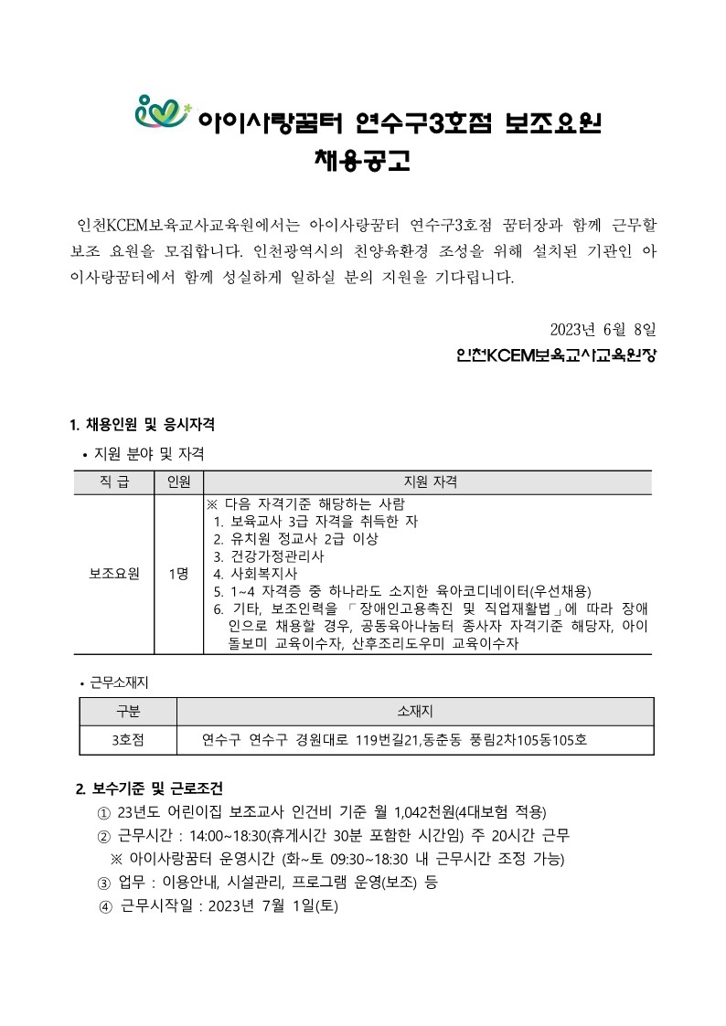 [연수구센터] 아이사랑꿈터 연수구3호점 보조요원 채용공고