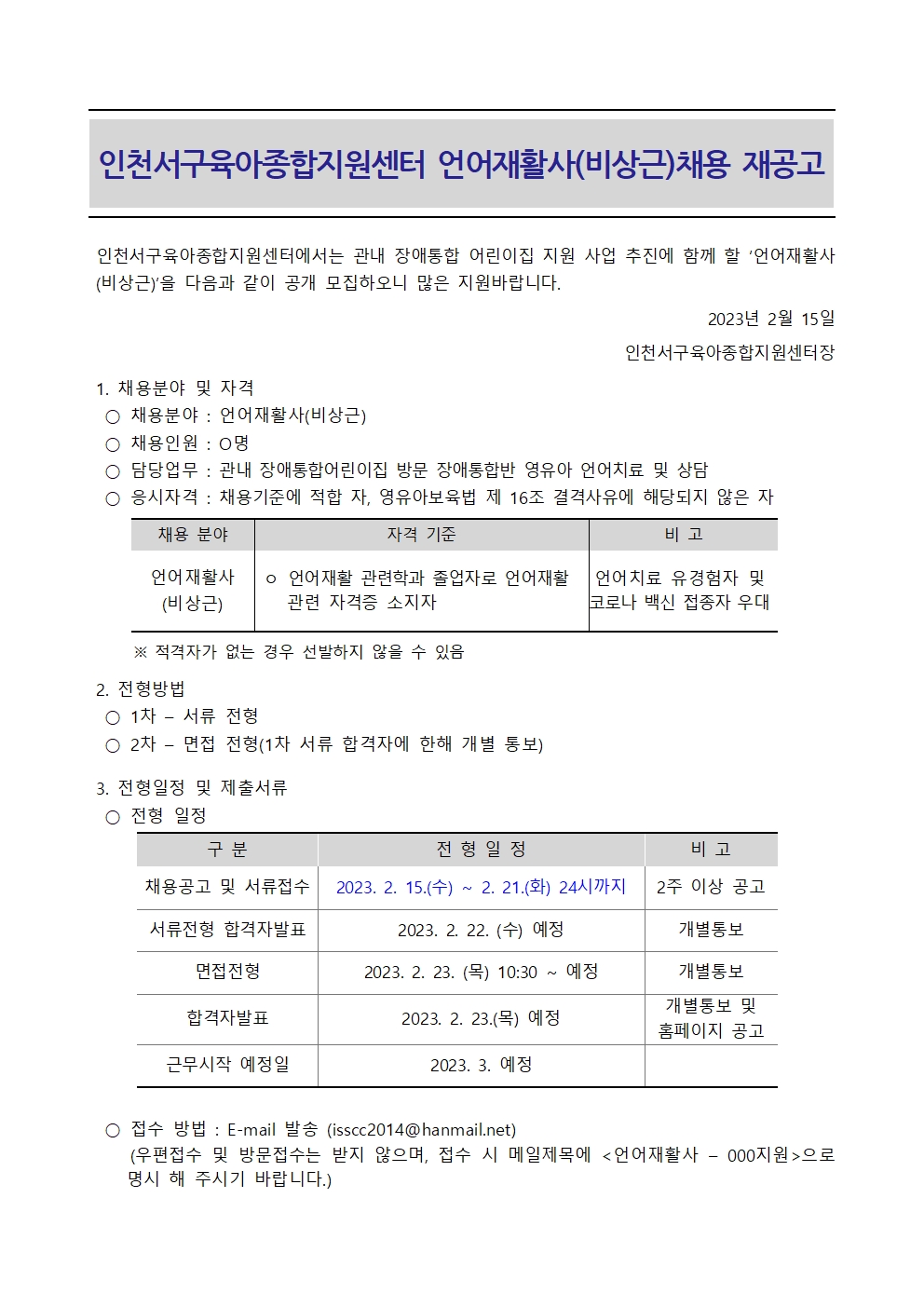 [서구센터] 언어재활사(비상근) 채용 공고