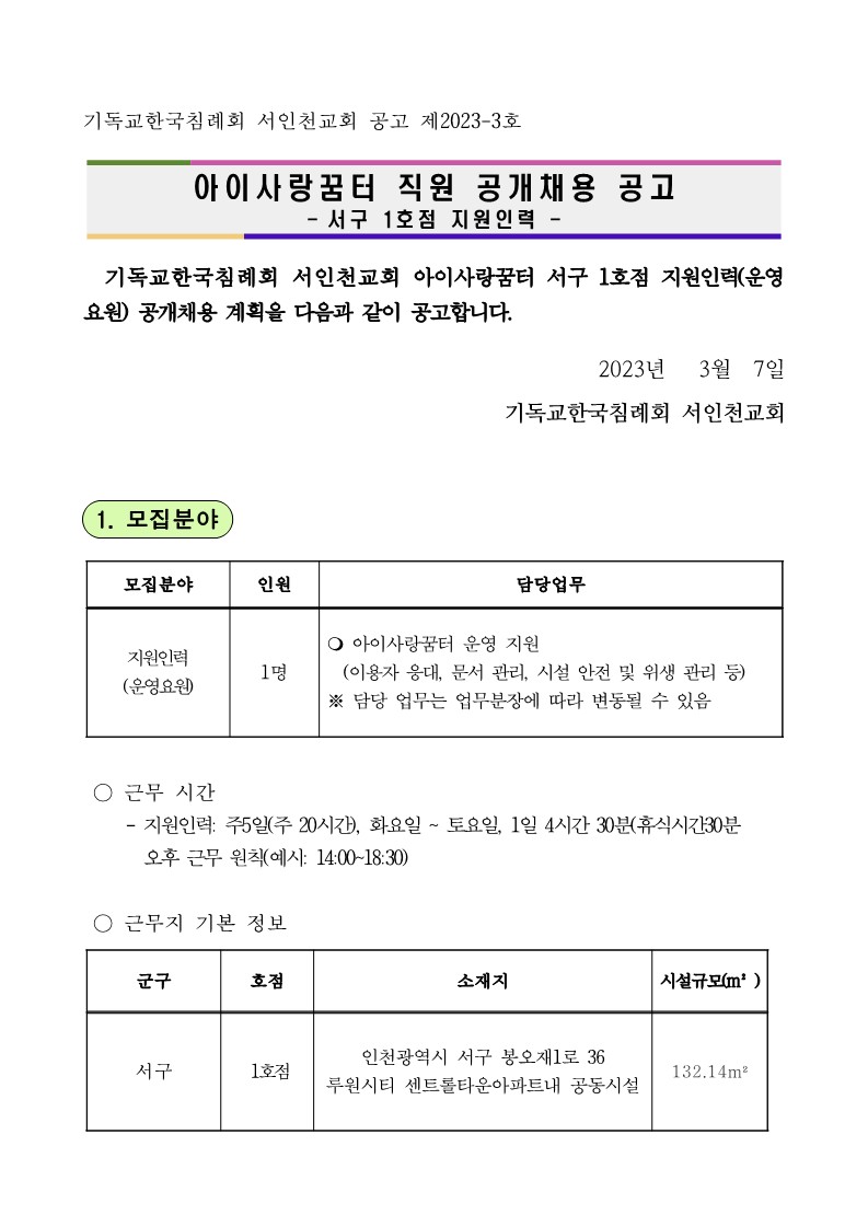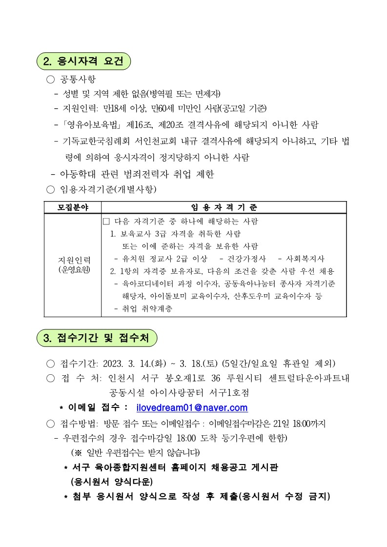 [서구센터] 아이사랑꿈터 직원 모집 공고