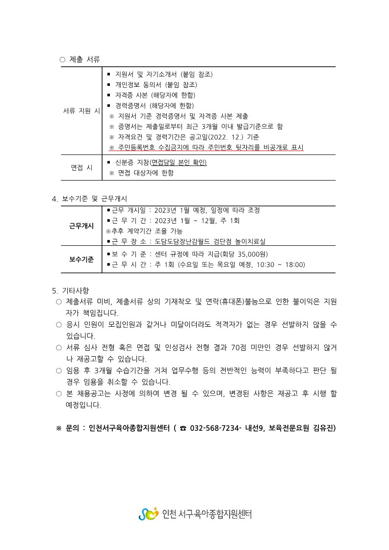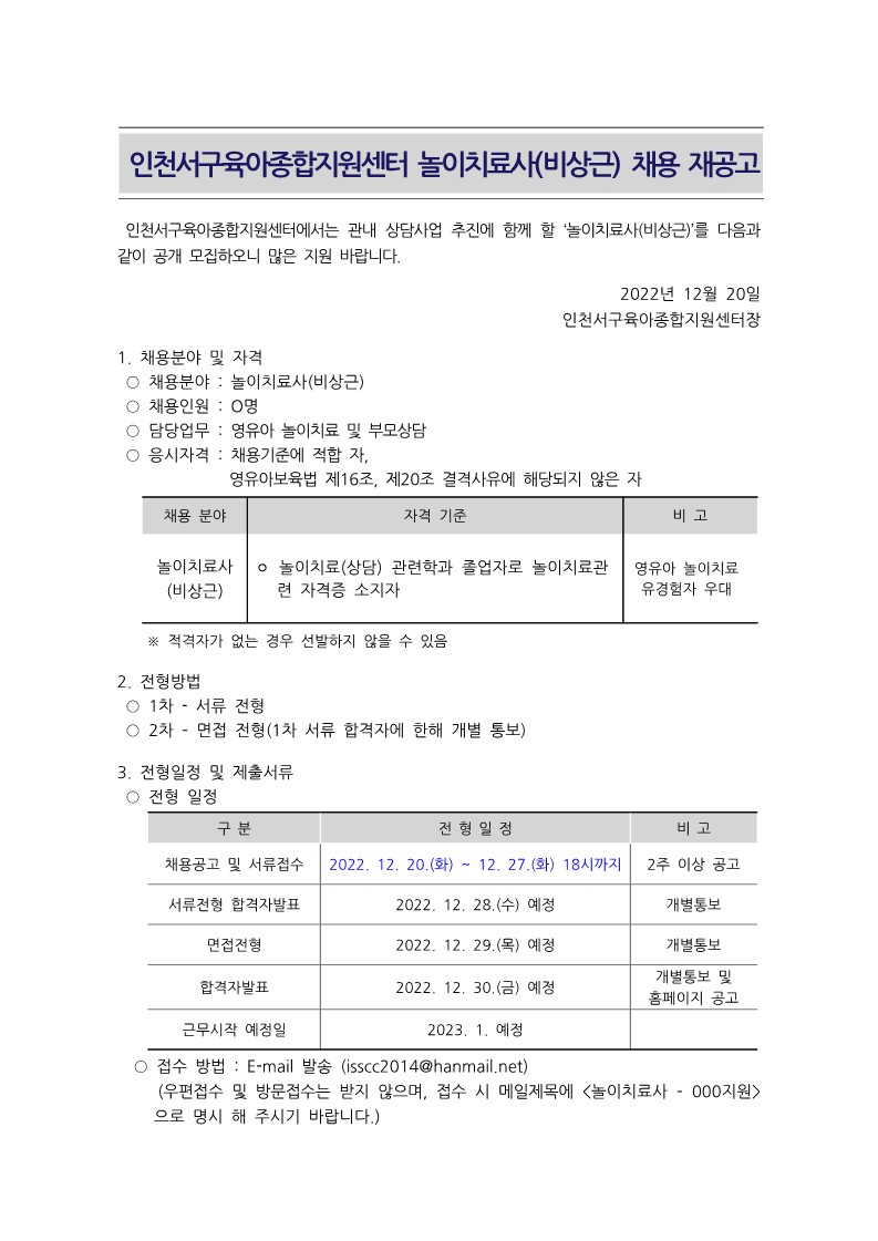 [서구센터] 놀이치료사(비상근) 채용 공고