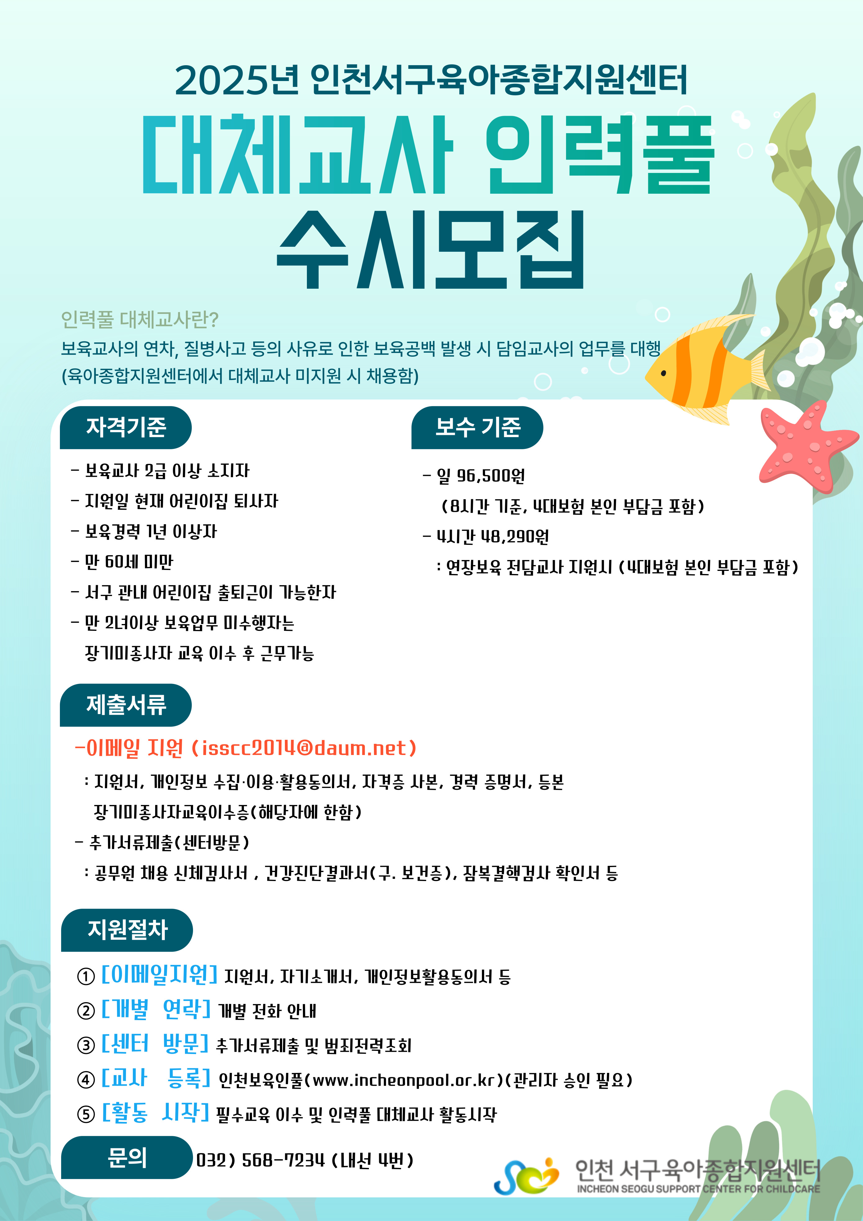 [인천서구육아종합지원센터] 8월 「인천서구육아종합지원센터 대체교사 인력풀 수시선발 공고」