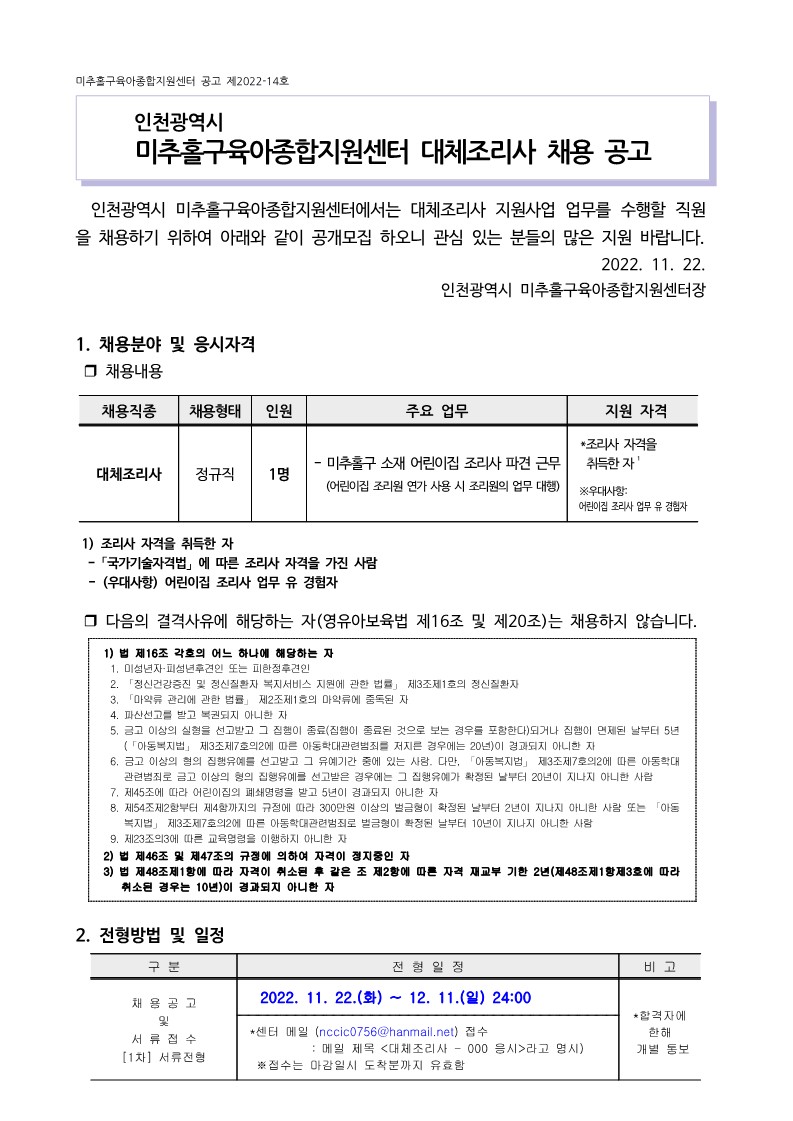[미추홀구센터] 대체조리사 채용 공고