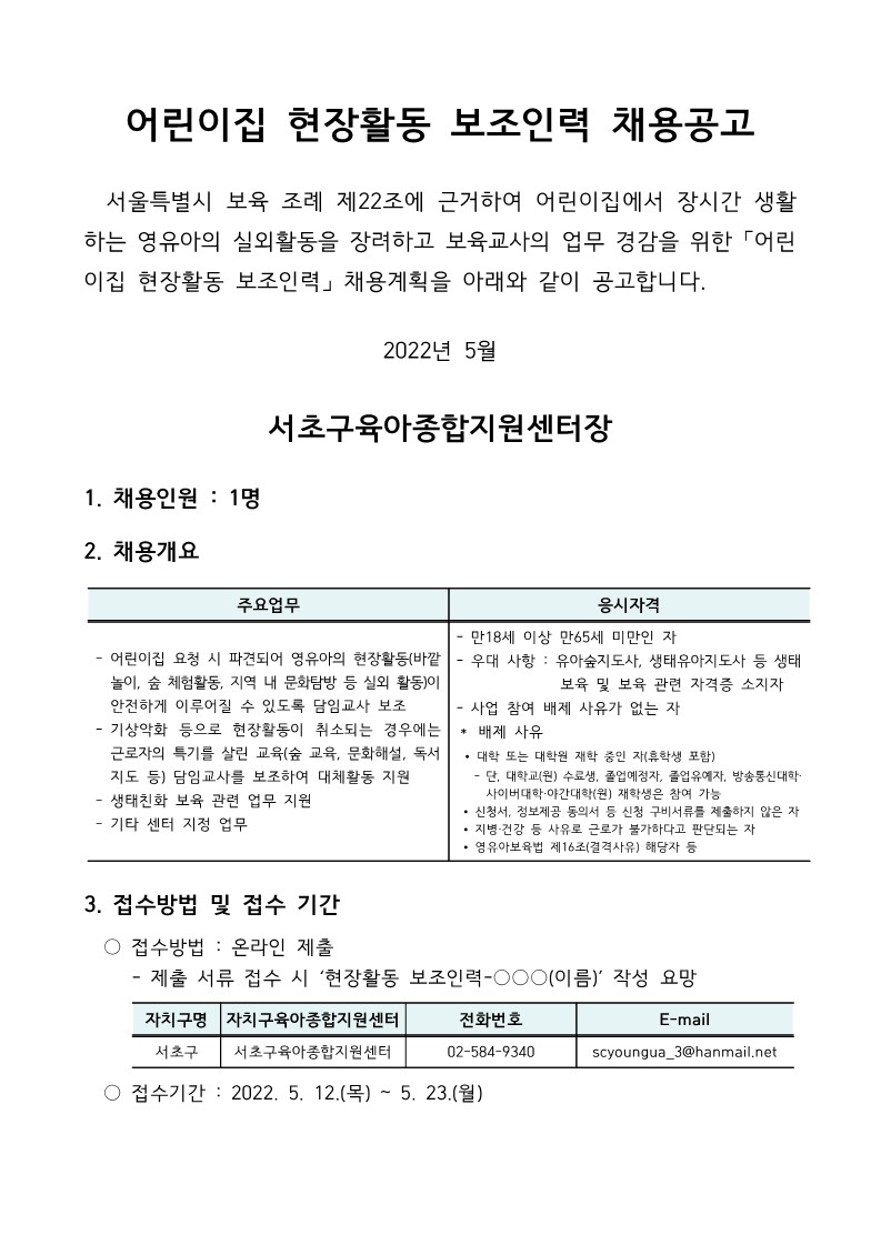 [서초구육아종합지원센터] 2022년 어린이집 현장활동 보조인력 채용공고문.pdf
