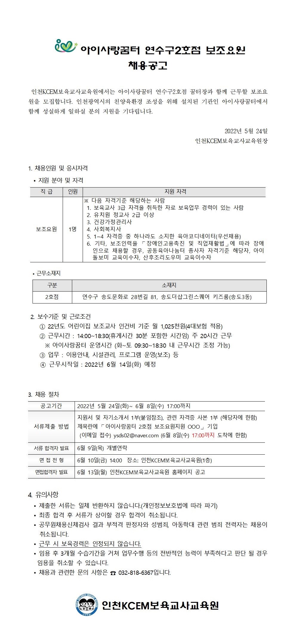 [연수구센터] 아이사랑꿈터 연수2호점 보조요원 채용공고