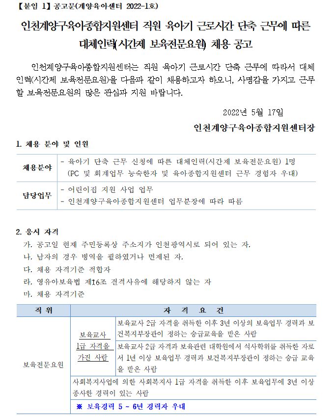 [붙임 1]공고문_직원 육아기 근로시간 단축 근무에 따른 대체인력(시간제 보육전문요원) 채용.hwp