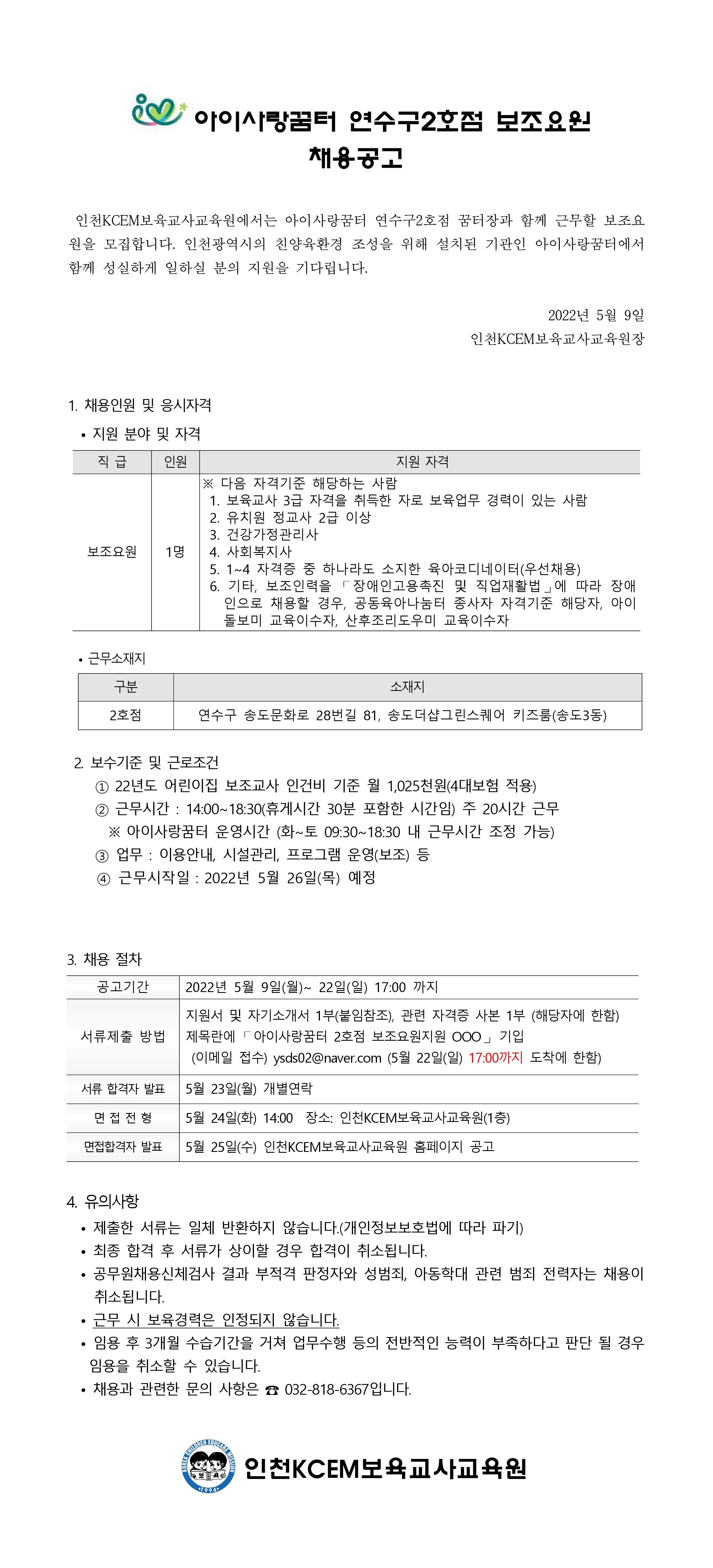 [연수구센터] 아이사랑꿈터 2호점 보조요원 채용공고