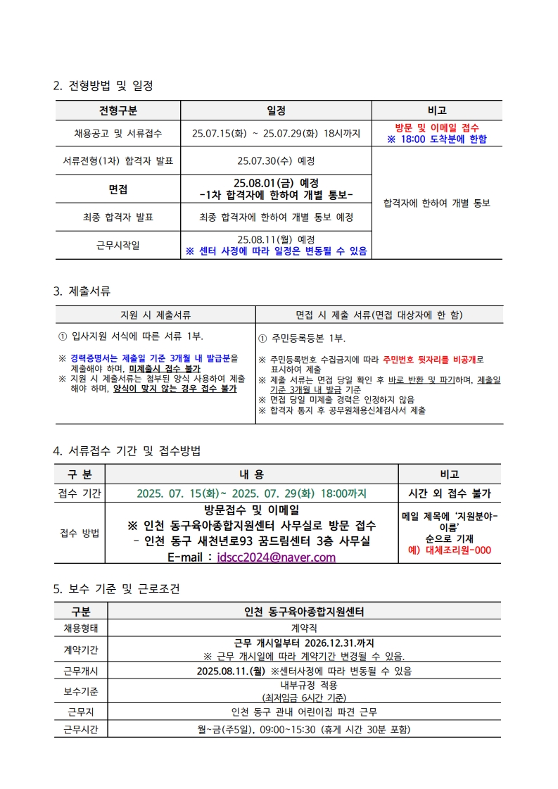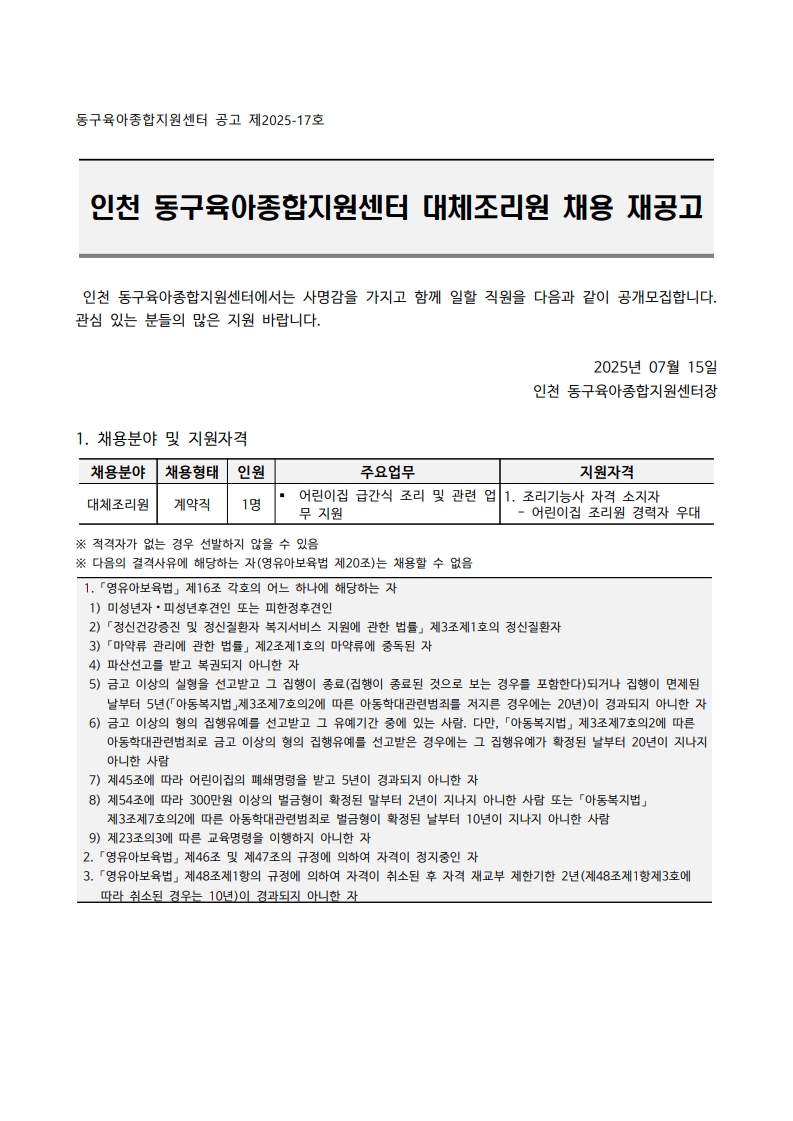 [인천 동구육아종합지원센터] 대체조리원 채용공고