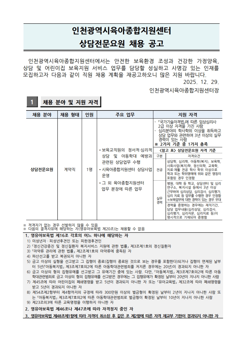 [인천광역시육아종합지원센터] 직원(상담전문요원) 채용