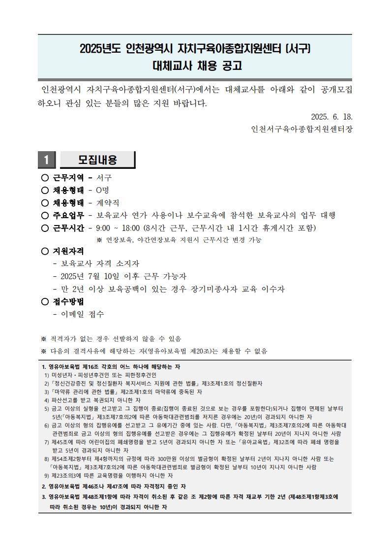 [인천서구육아종합지원센터] 2025년 10차 대체교사 채용 공고