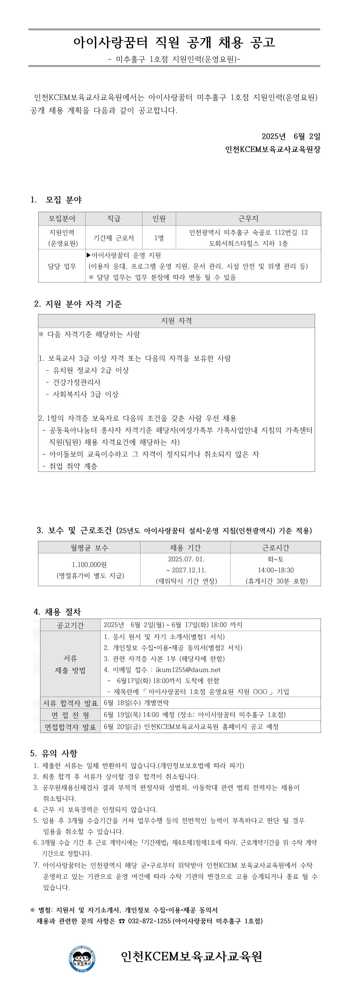 [아이사랑꿈터 미추홀구 1호점] 지원인력 채용공고