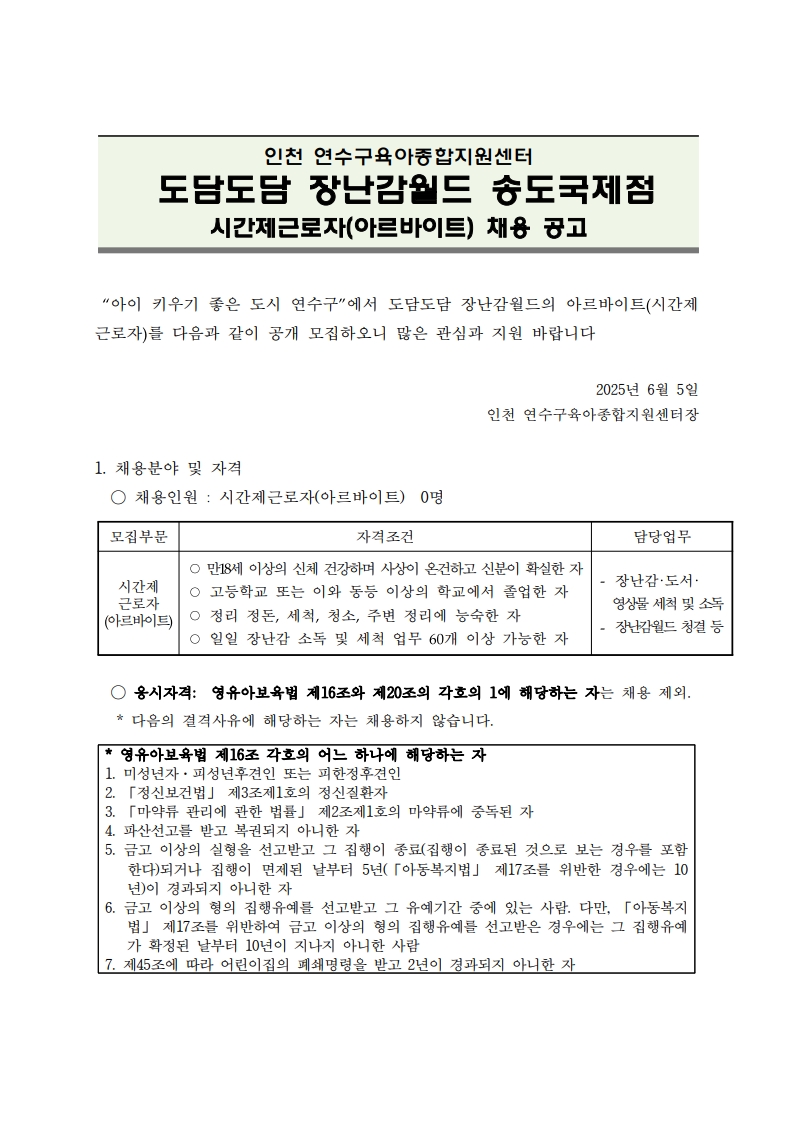 연수구 도담도담장난감월드 기간제 아르바이트 채용공고