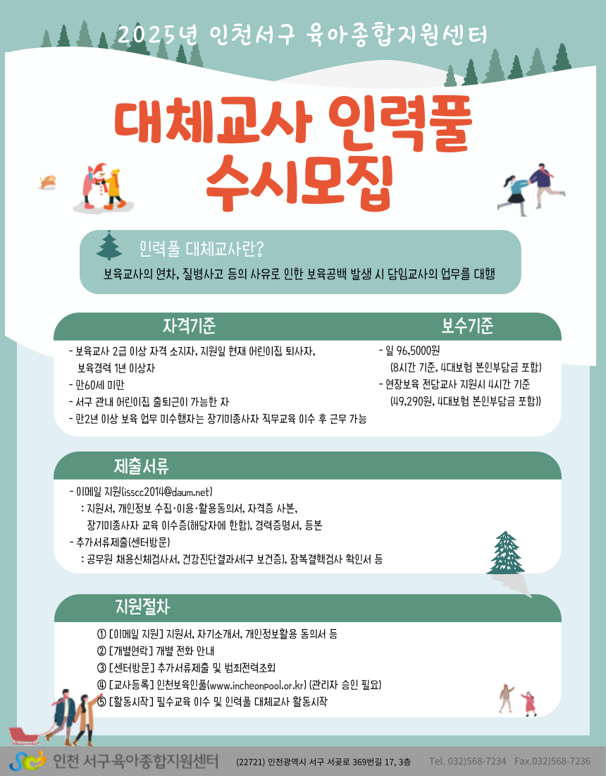 [서구육아종합지원센터] 「인천서구육아종합지원센터 대체교사 인력풀 수시선발 공고」