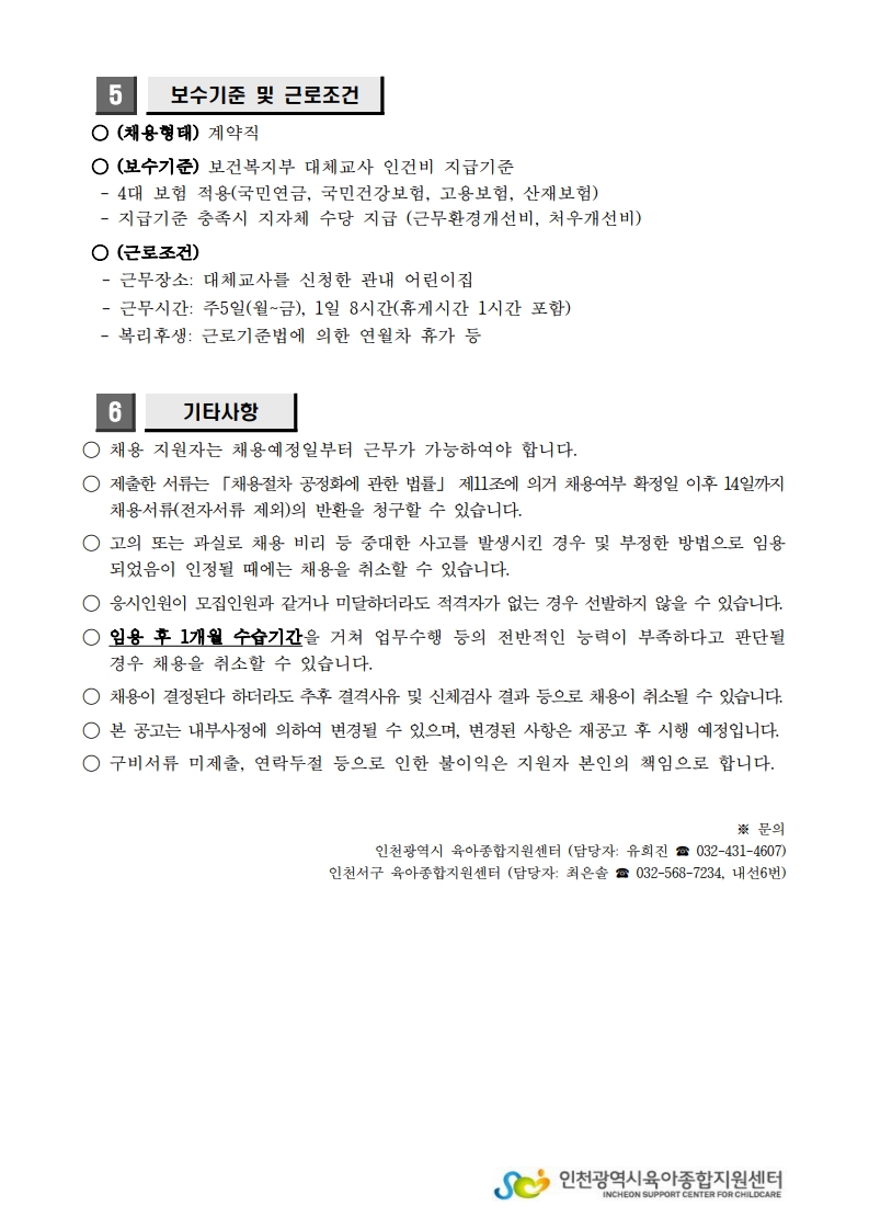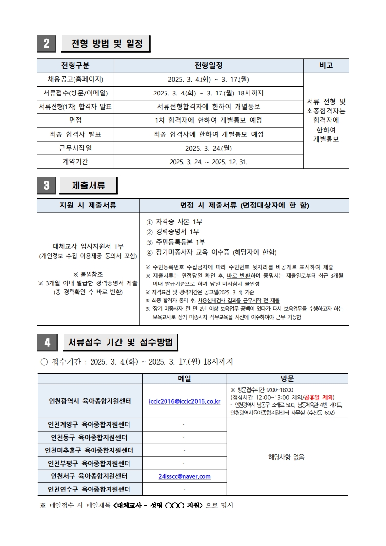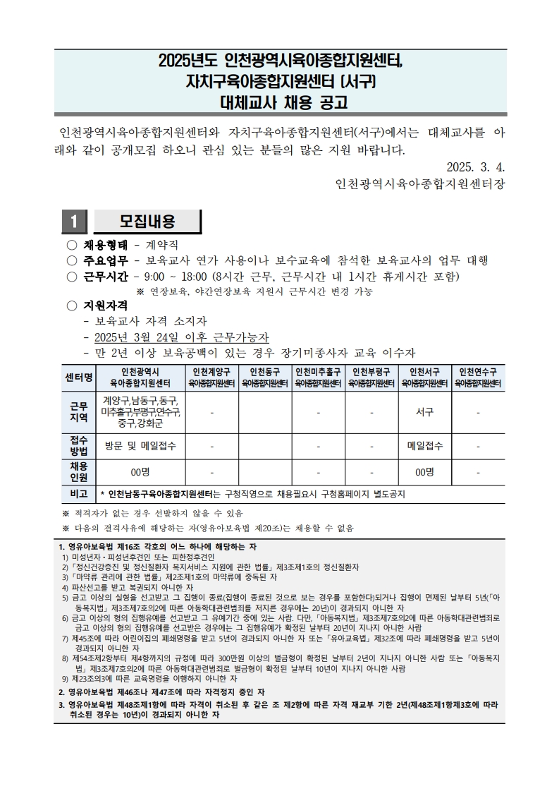 [인천광역시육아종합지원센터] 「2025년도 대체교사지원사업」 대체교사 인력채용
