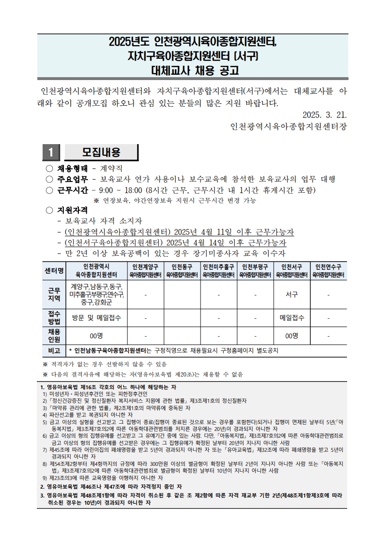 [인천광역시육아종합지원센터] 「2025년도 대체교사지원사업」 대체교사 인력채용