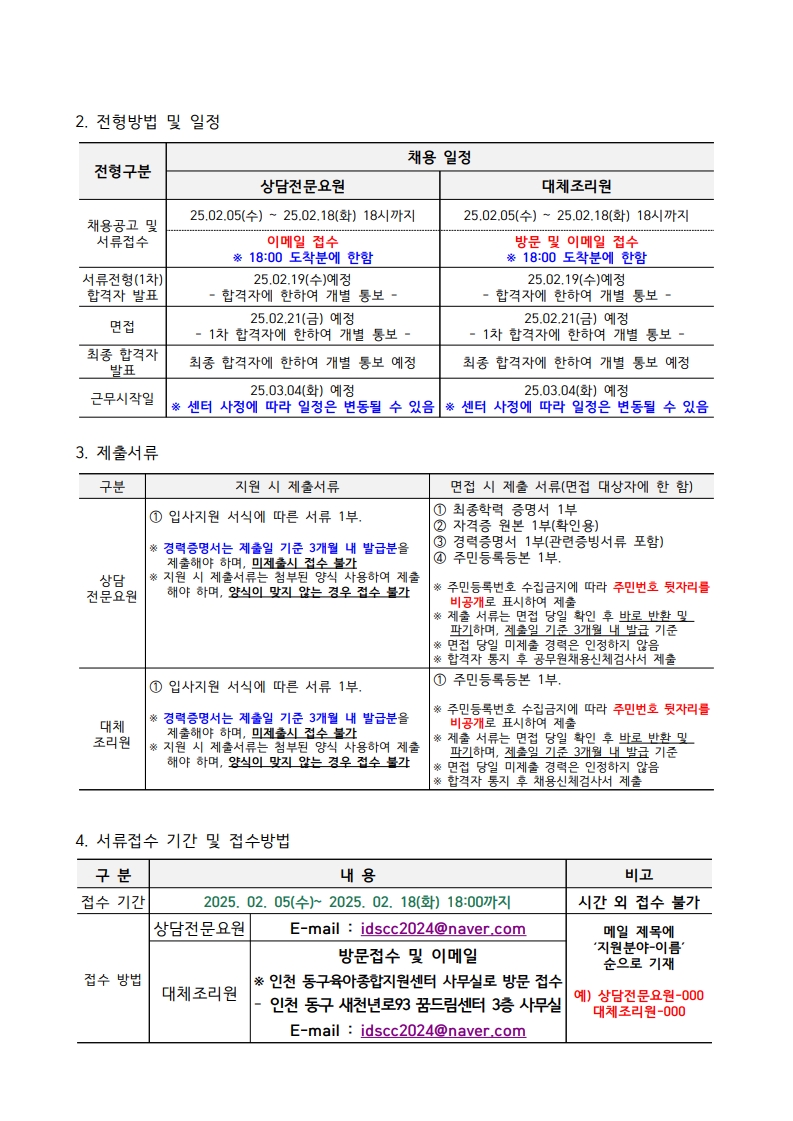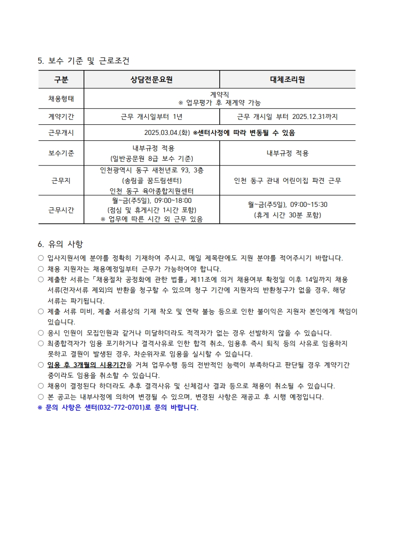[인천 동구육아종합지원센터] 직원 채용(상담전문요원, 대체조리원) 공고