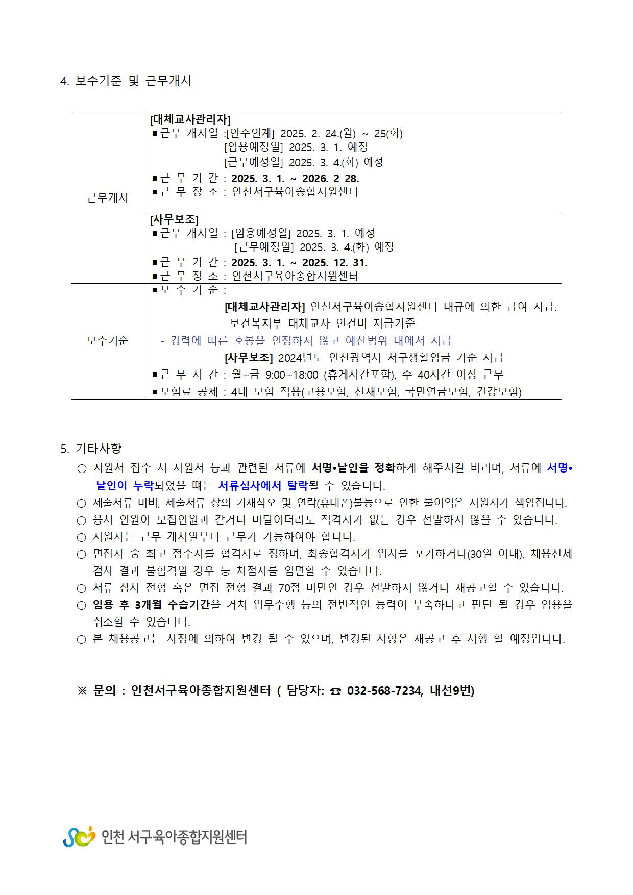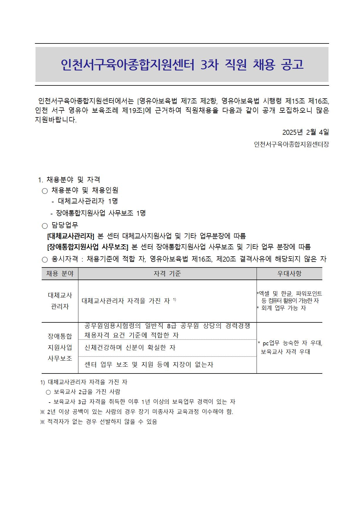 [서구육아종합지원센터]대체교사관리자 채용 및 장애통합지원사업 사무보조(기간제)채용공고