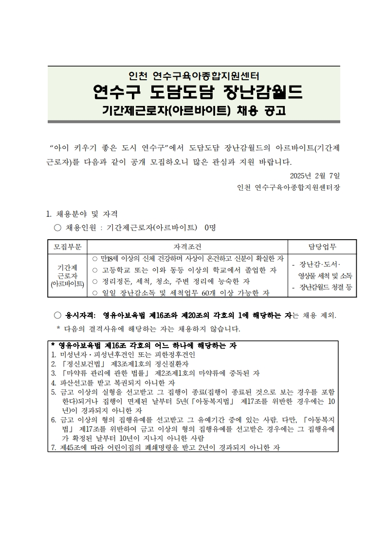 [연수구육아종합지원센터]도담도담 장난감월드 기간제(아르바이트) 근로자 채용공고
