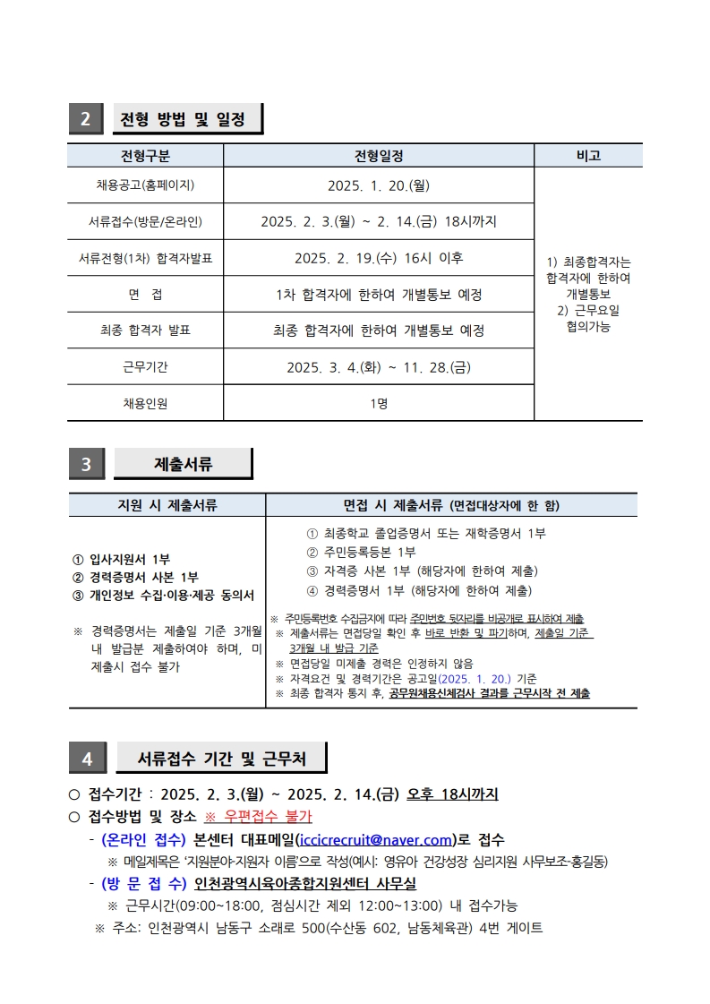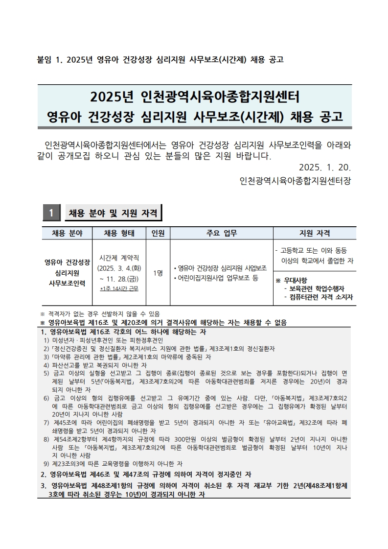 [인천광역시육아종합지원센터] 2025년 「영유아 건강성장 심리지원」 사무보조(시간제) 채용공고