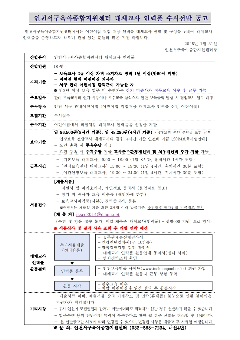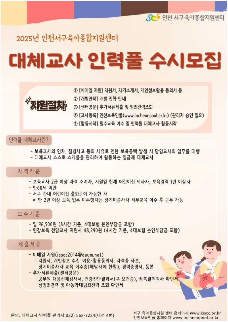 [서구육아종합지원센터] 「인천서구육아종합지원센터 대체교사 인력풀 수시선발 공고」