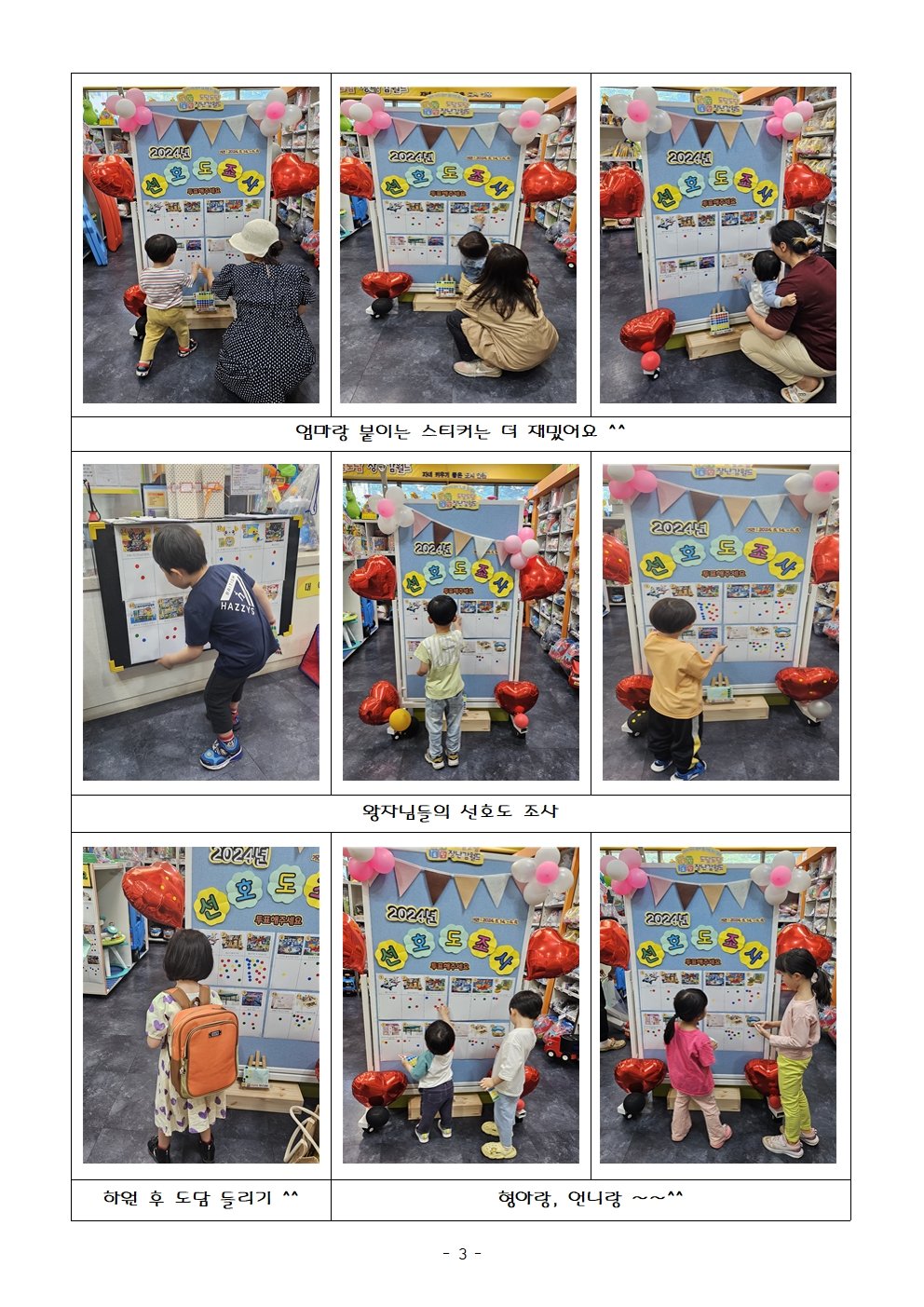 '2024년 1차 장난감 선호도 조사'에 참여헤 주신 이용자분들께 감사드립니다. 선호물품을 파악하여 신규 장난감 구입에 최대한 반영 될 수 있도록 노력하겠습니다.