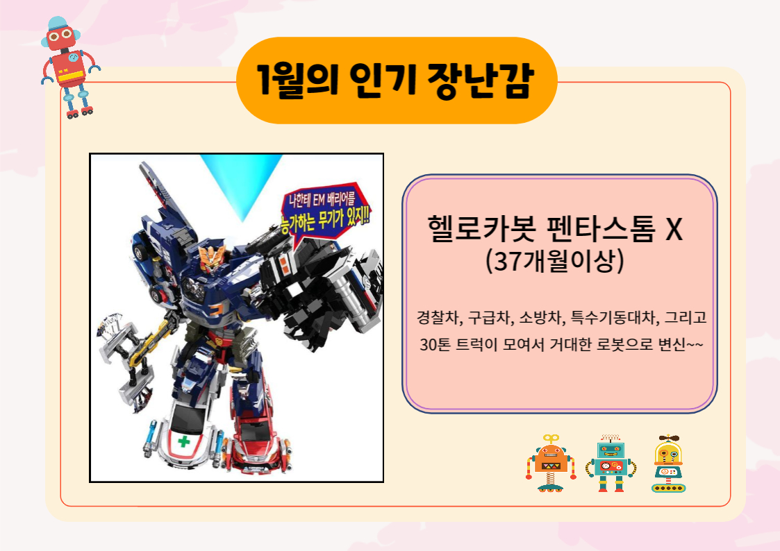 * 1월달 인기장난감으로 선정된 헬로카봇 펜타스톰 X 로봇은 아이들의 소근육운동과 공감능력을 키워주는 장난감입니다^^
