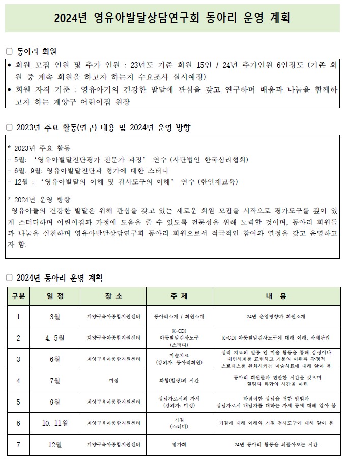 2024년 영유아 발달삼리 상담 연구회 운영 계획(안)